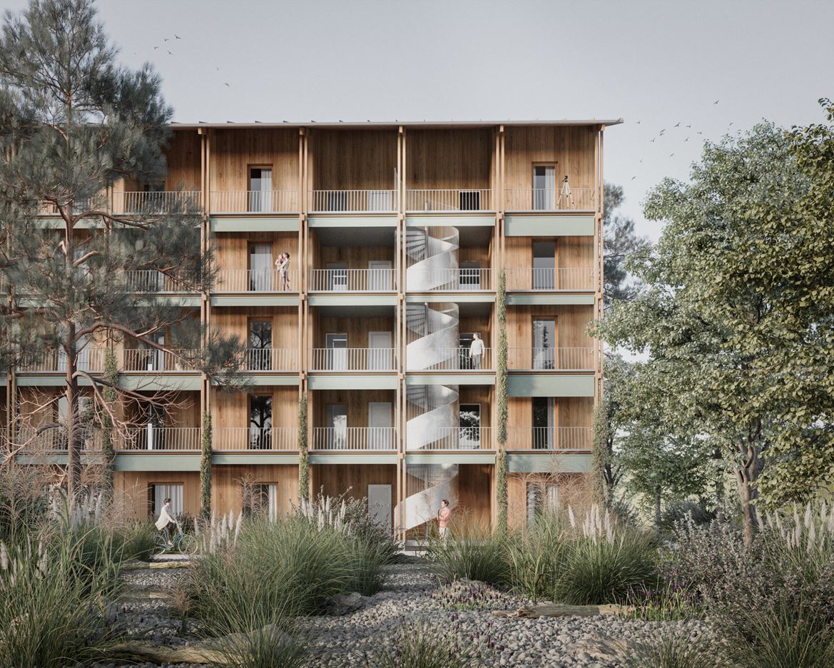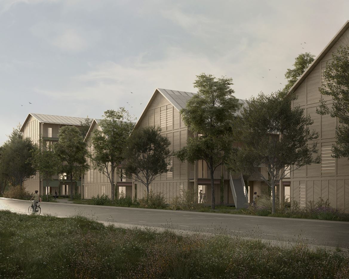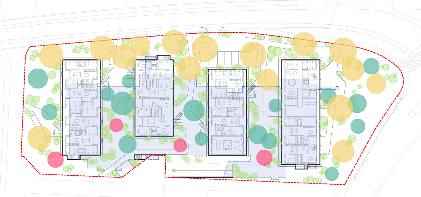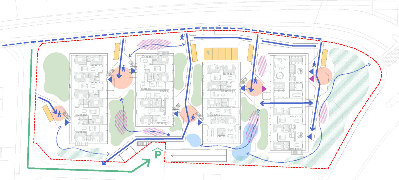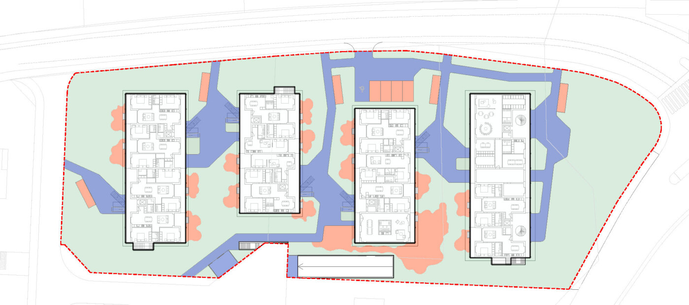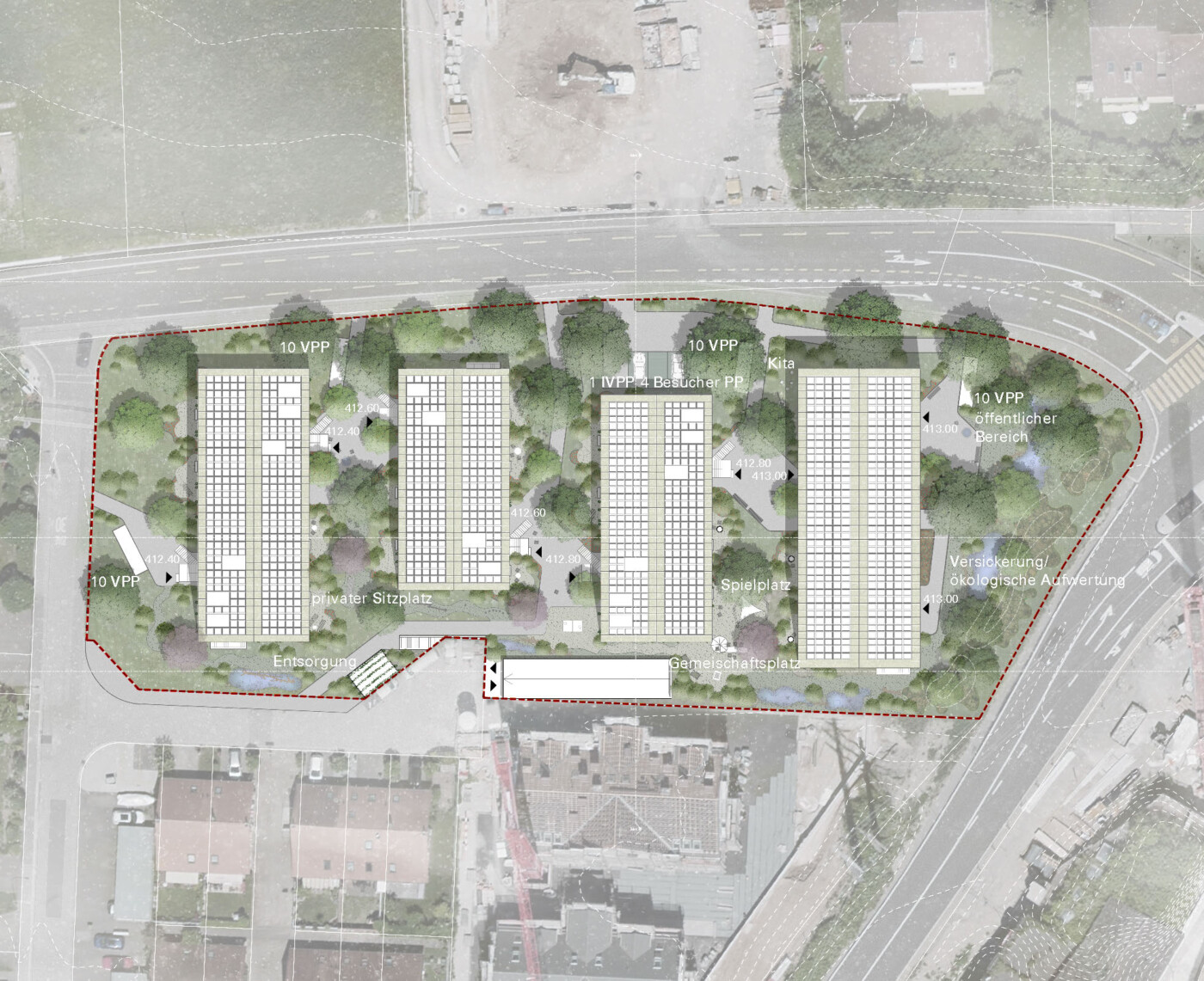 Zwischen den Riegelbauten entstehen drei parkartige, offene Hofräume. Sie sind multifunktional und bieten Aneignungsmöglichkeiten für alle Nutzer. Zwischen den barrierefreien Zugängen zu den Wohnungen befinden sich öffentlich nutzbare Vorplätze, die von der Zürcherstrasse aus mit schmalen Asphaltwegen erschlossen sind. Versehen mit hellen Hartbelägen und diversen Sitzmöglichkeiten bilden sie das kommunikative Rückgrat des Aussenraumes. Südlich anschliessend befinden sich halböffentliche Grünflächen mit informellen Trittwegen. Diese kiesigen Flächen, versehen mit verstreuten Spielelementen und mobiler Bestuhlung, bieten Platz für Aufenthalt, Erholung und freies Spielen. Private Sitzplätze werden topografisch und durch adäquate Vegetation von der restlichen Anlage abgesetzt. Ein zentraler Treffpunkt und das Herz der Wohnanlage bildet der Gemeinschaftsplatz mit dem grossen Aussensitzplatz und einem Aussengrill. Während die Wasser- und Sandspielfläche mit Sonnensegel Spielmöglichkeiten für kleinere Kinder bietet, stellen die kiesigen Mulden und zahlreiche Balancierelemente aus Naturholz entlang der Wege kreative Spielräume für grössere Kinder dar. Kleinere bis mittelgrosse Gehölze, die ProSpecieRara Obstbäume, insektenfreundliche Sträucher und Stauden prägen den Aussenraum.