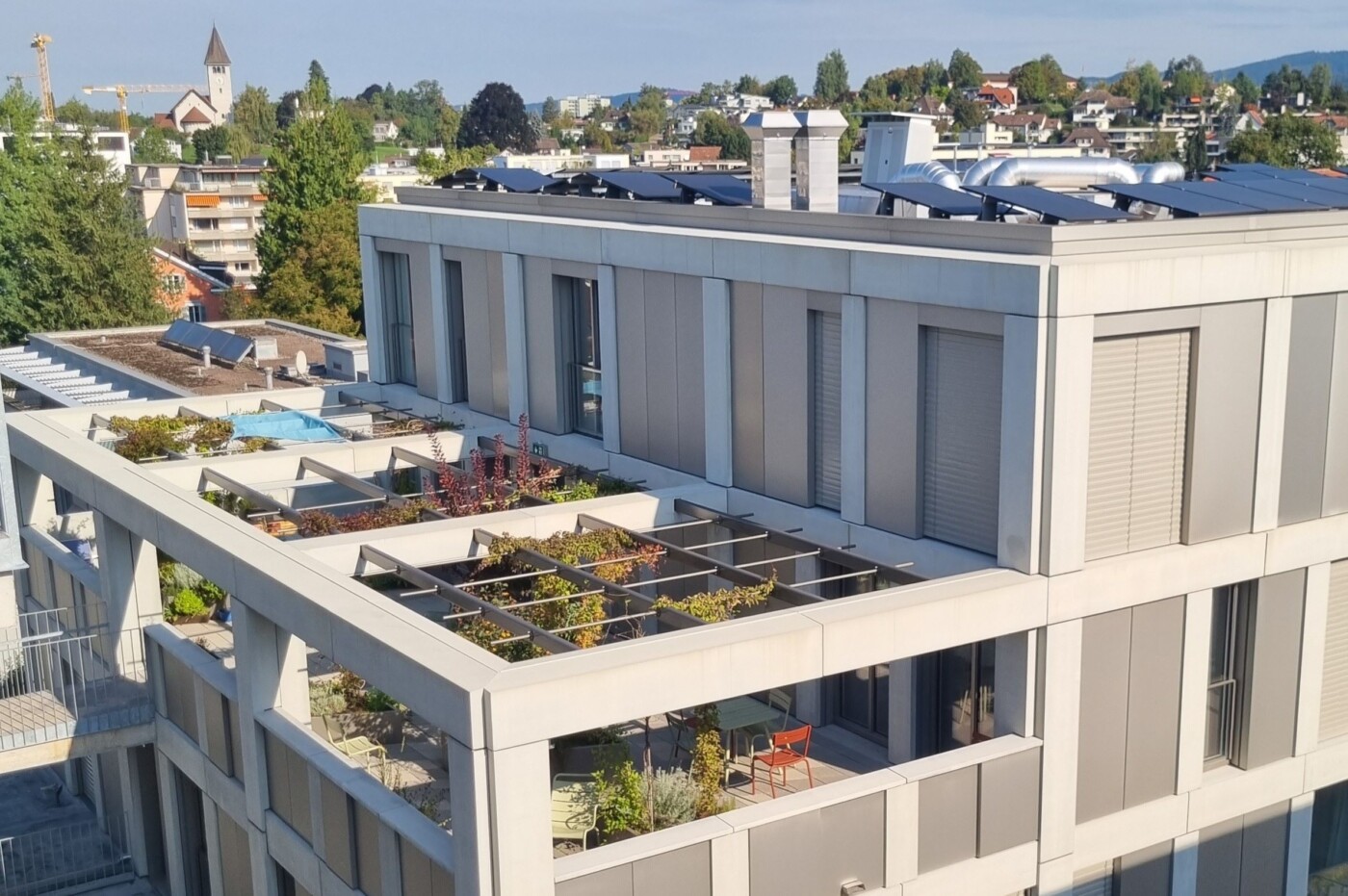 Die von SKK projektierte Umgebung des Zürcher Oberland Medienhaus in Wetzikon zeigt sich in einem tollen vitalen und grünen Zustand. Der Dachgarten ist eingewachsen und wird aktiv genutzt.