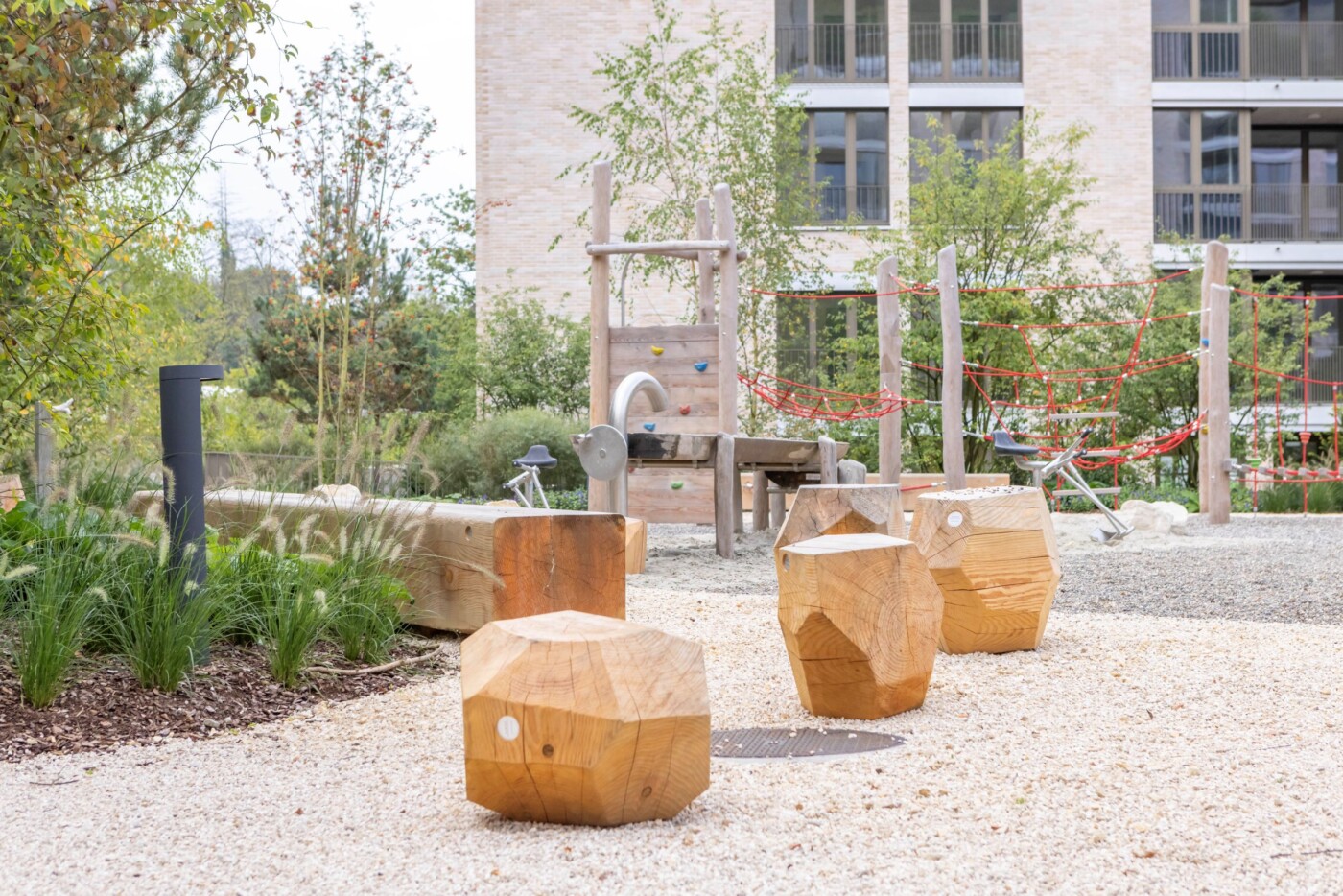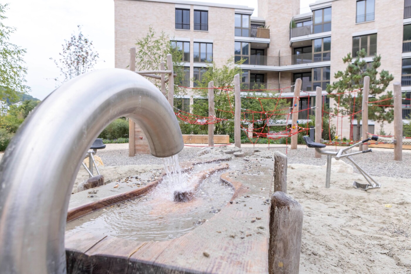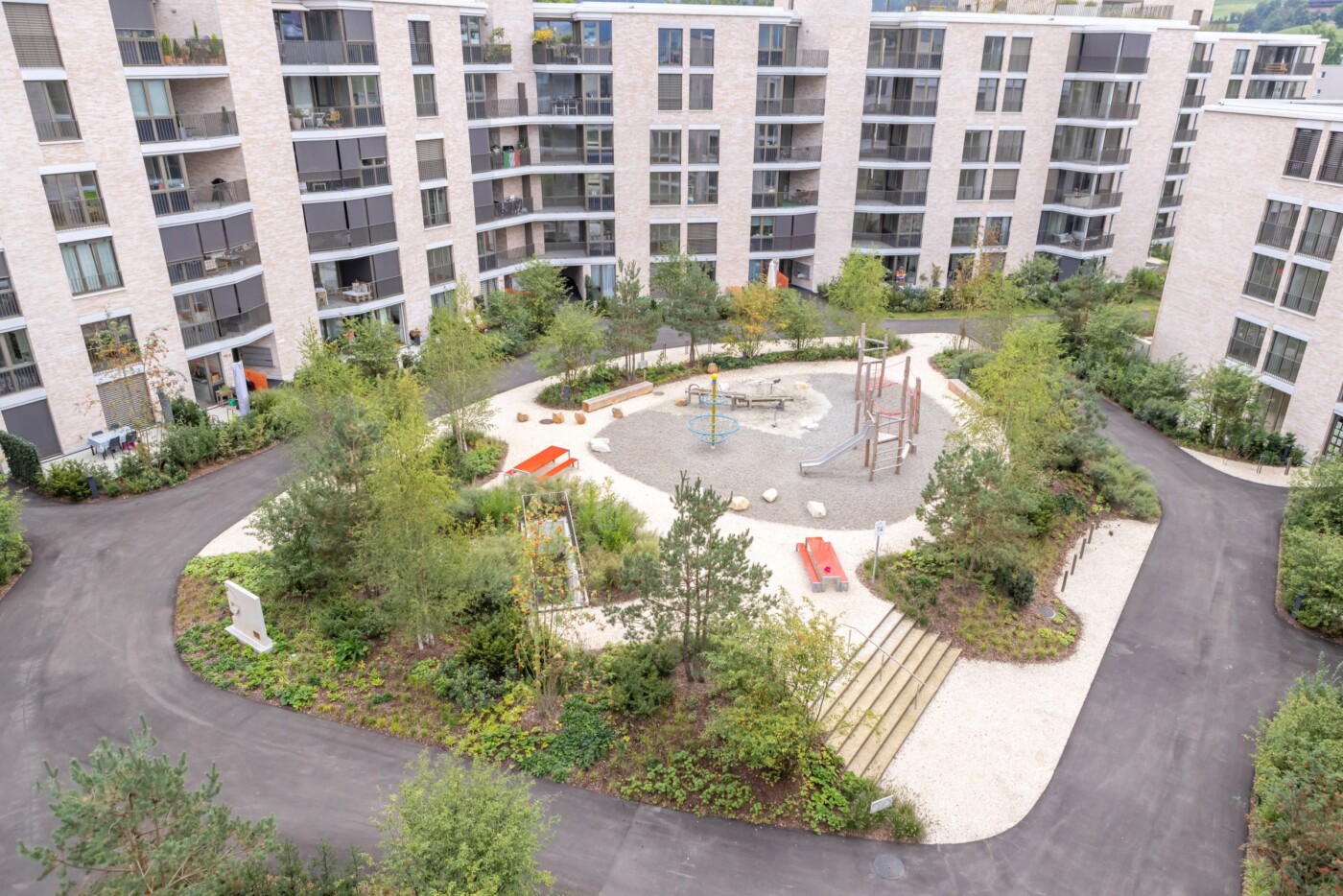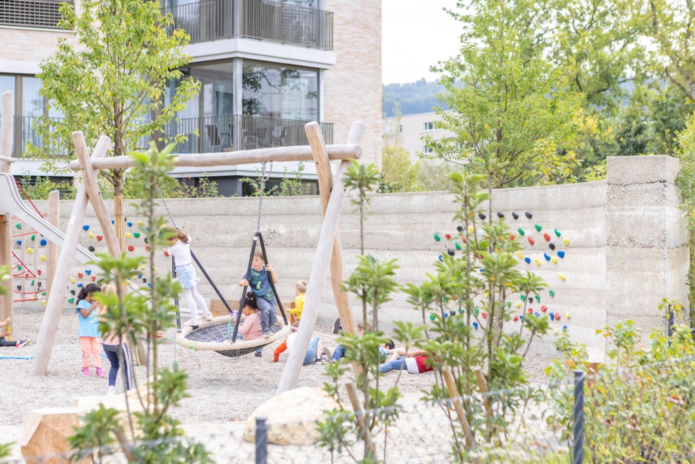 Die Grossüberbauung mit 168 Wohnungen verfügt über einen Gemeinschaftsraum, verschiedene Plätze und Spiellandschaften und gemeinschaftlich nutzbare Dachgärten sowie einen eigenen Doppelkindergarten mit einer separaten Aussenanlage.