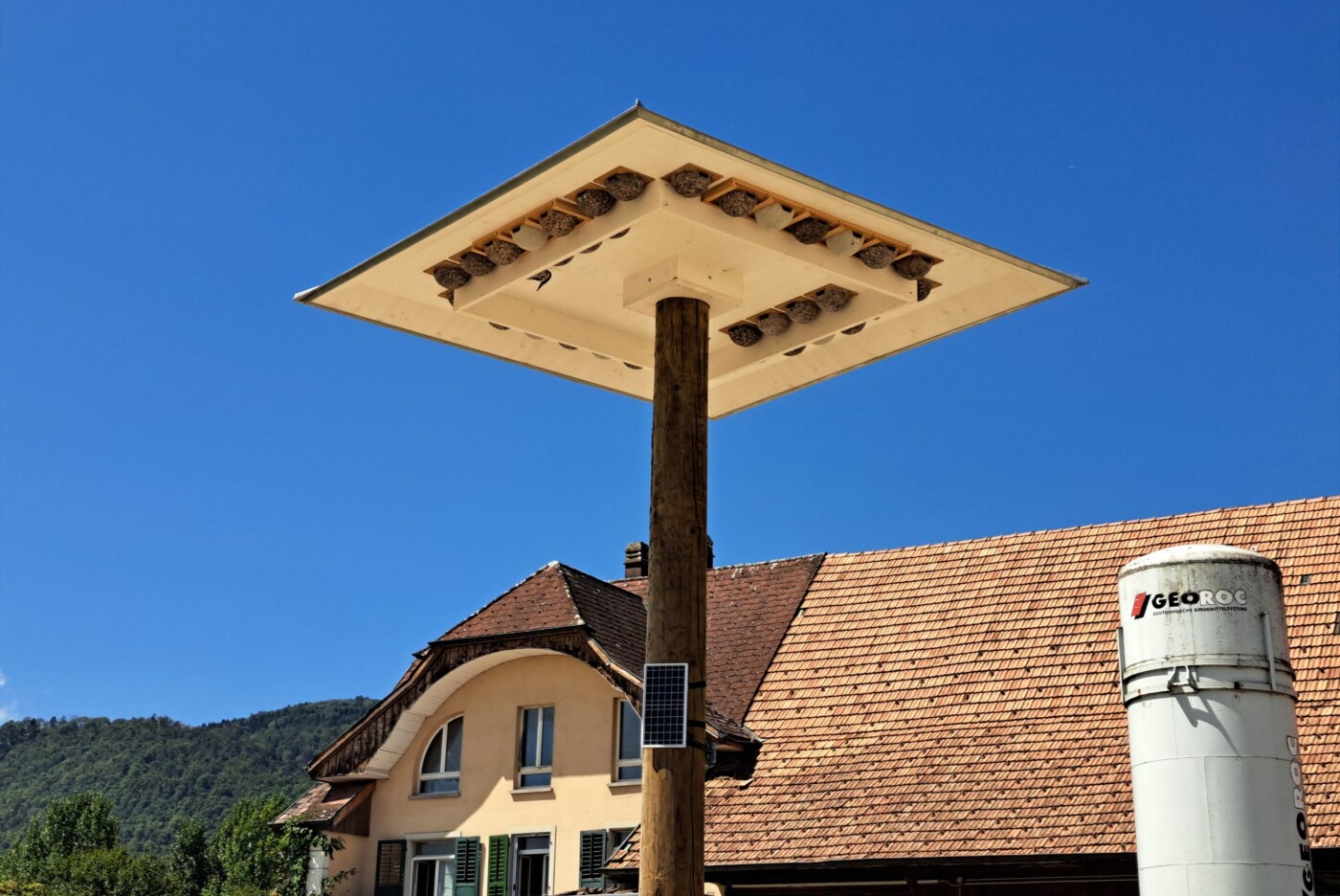Neben den Türmen wurden auch an einem weiteren, nahegelegenen Hof zusätzlich Mehlschwalben-Nisthilfen montiert. Diese werden bereits von einigen Vögeln angenommen und zeigen, dass gezielte Massnahmen zum Erhalt der Art Wirkung zeigen.
