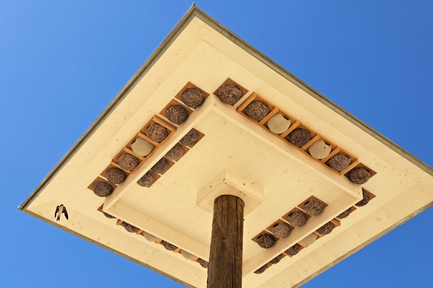 Nahaufnahme der Nisthilfen am Mehlschwalbenturm.