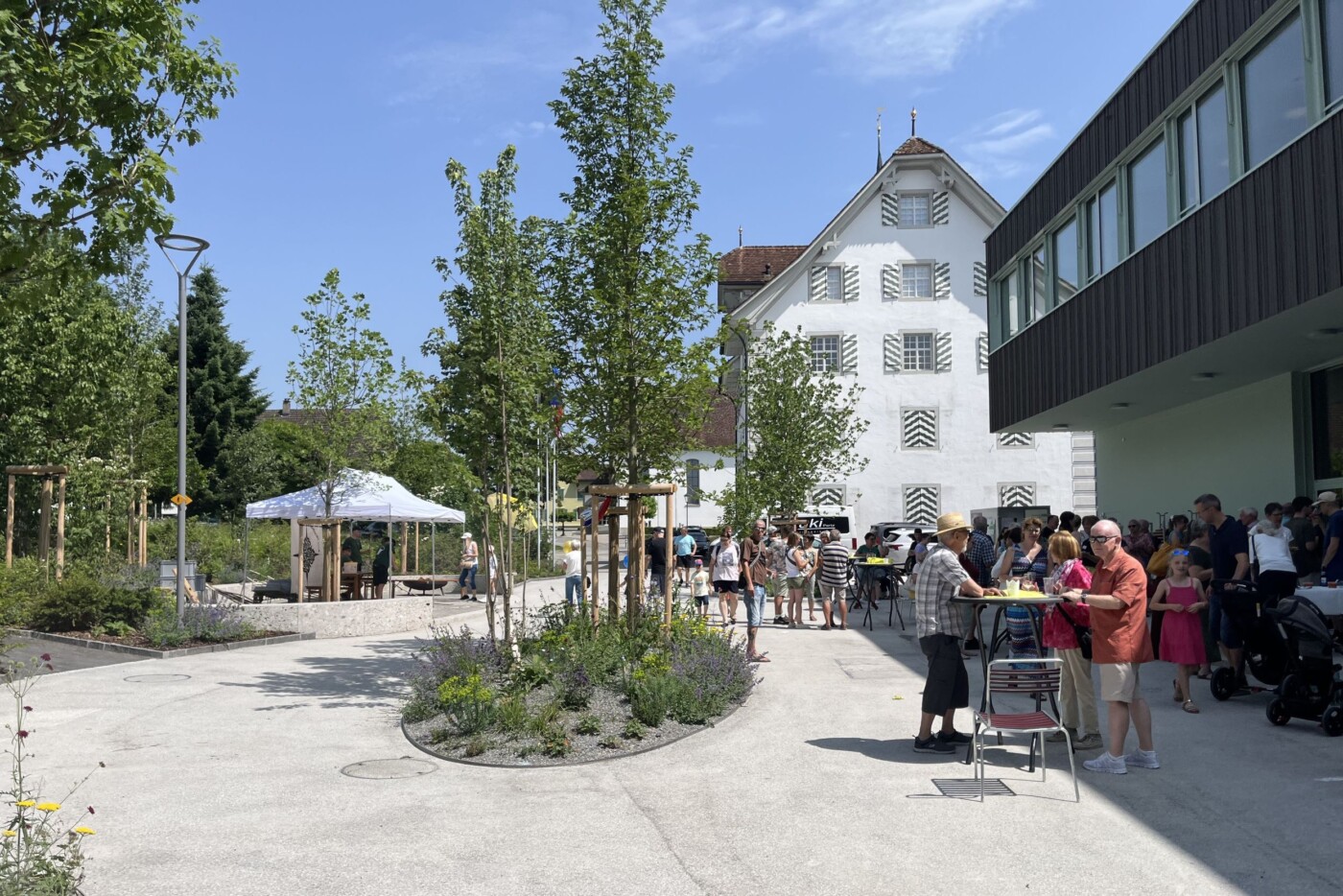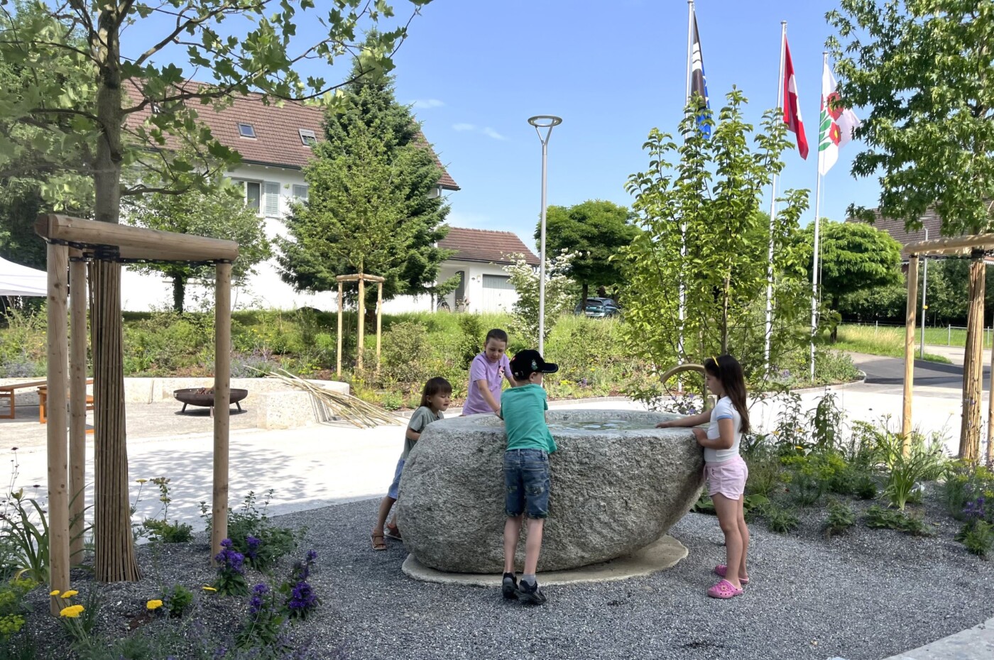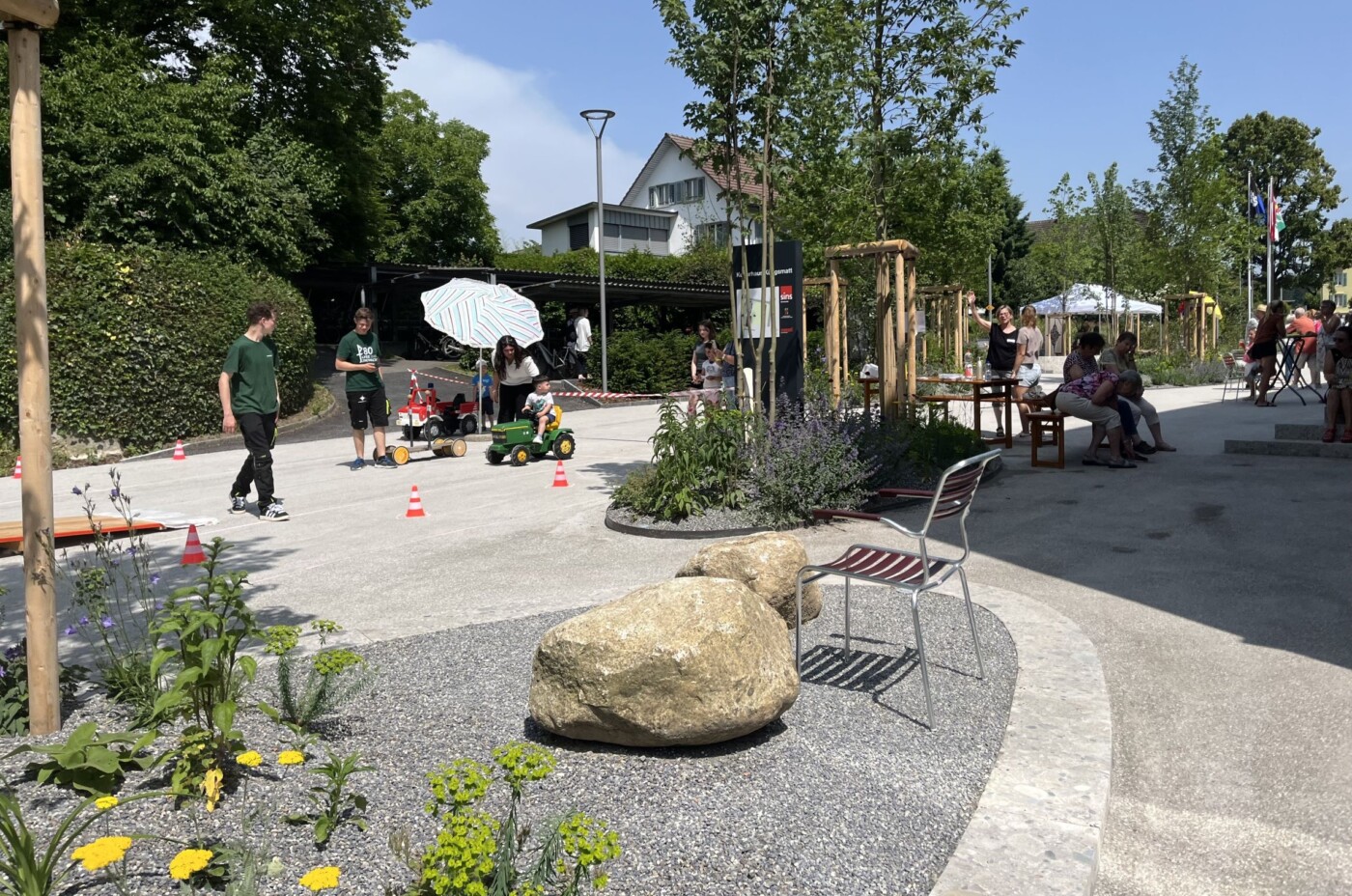 Die Strasse wurde zu einem mit vielen Zukunftsbäumen beschatteten Platz mit hellem Farbasphalt gewandelt. Aperoplätze für verschiedene Anlässe und ein wunderschöner Findling-Brunnen konnten dabei integriert werden.