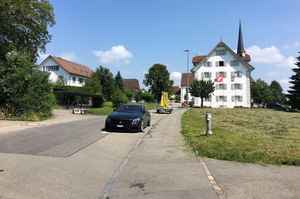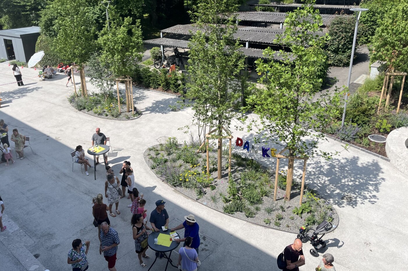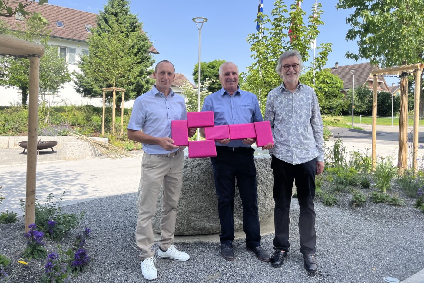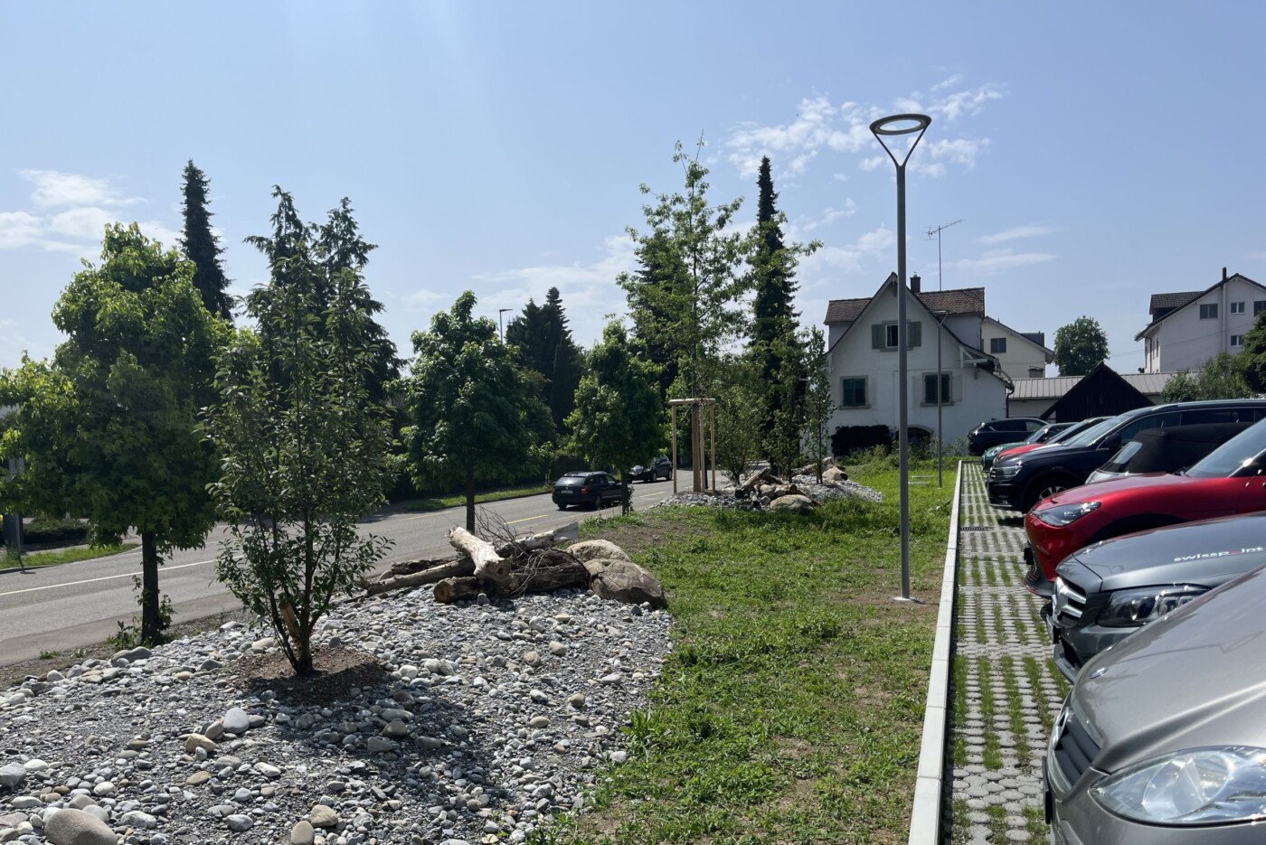 Die Strasse wurde zu einem mit vielen Zukunftsbäumen beschatteten Platz mit hellem Farbasphalt gewandelt. Aperoplätze für verschiedene Anlässe und ein wunderschöner Findling-Brunnen konnten dabei integriert werden.