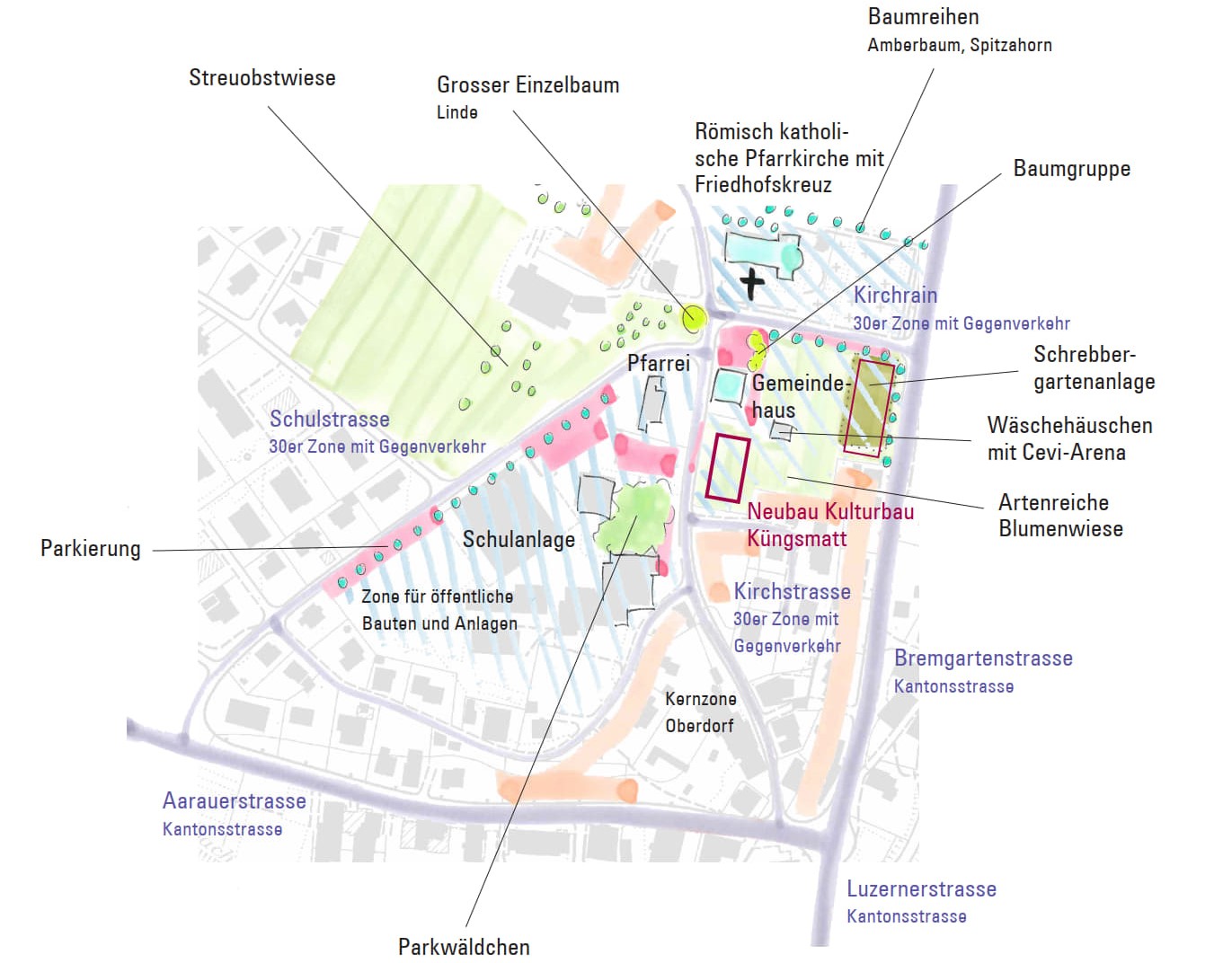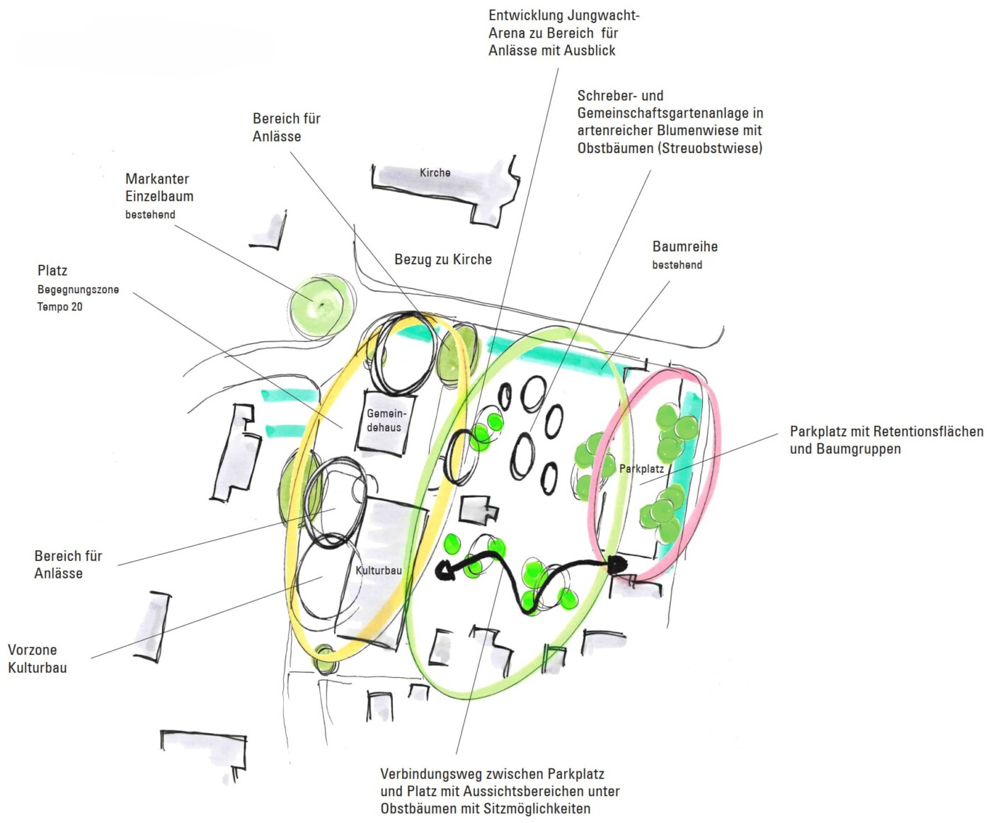 Die Wiese unterhalb des Gemeindehauses konnte einen Parkplatz aufnehmen und zu einer Streuobstwiese mit Hochstammbäumen (ProSpecieRara) gewandelt werden. Einmal jährlich dient diese zukünftig als Freiluftkino.