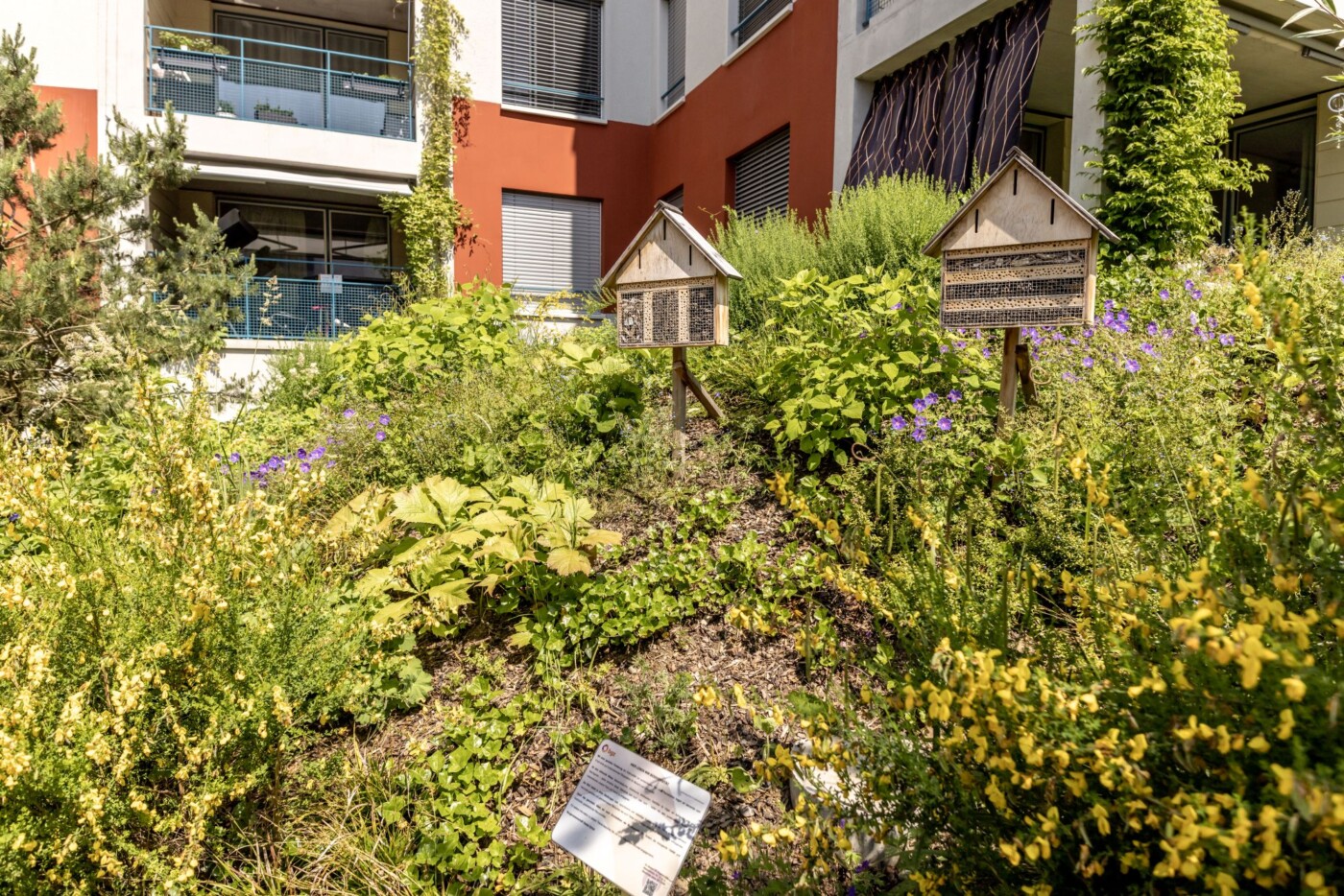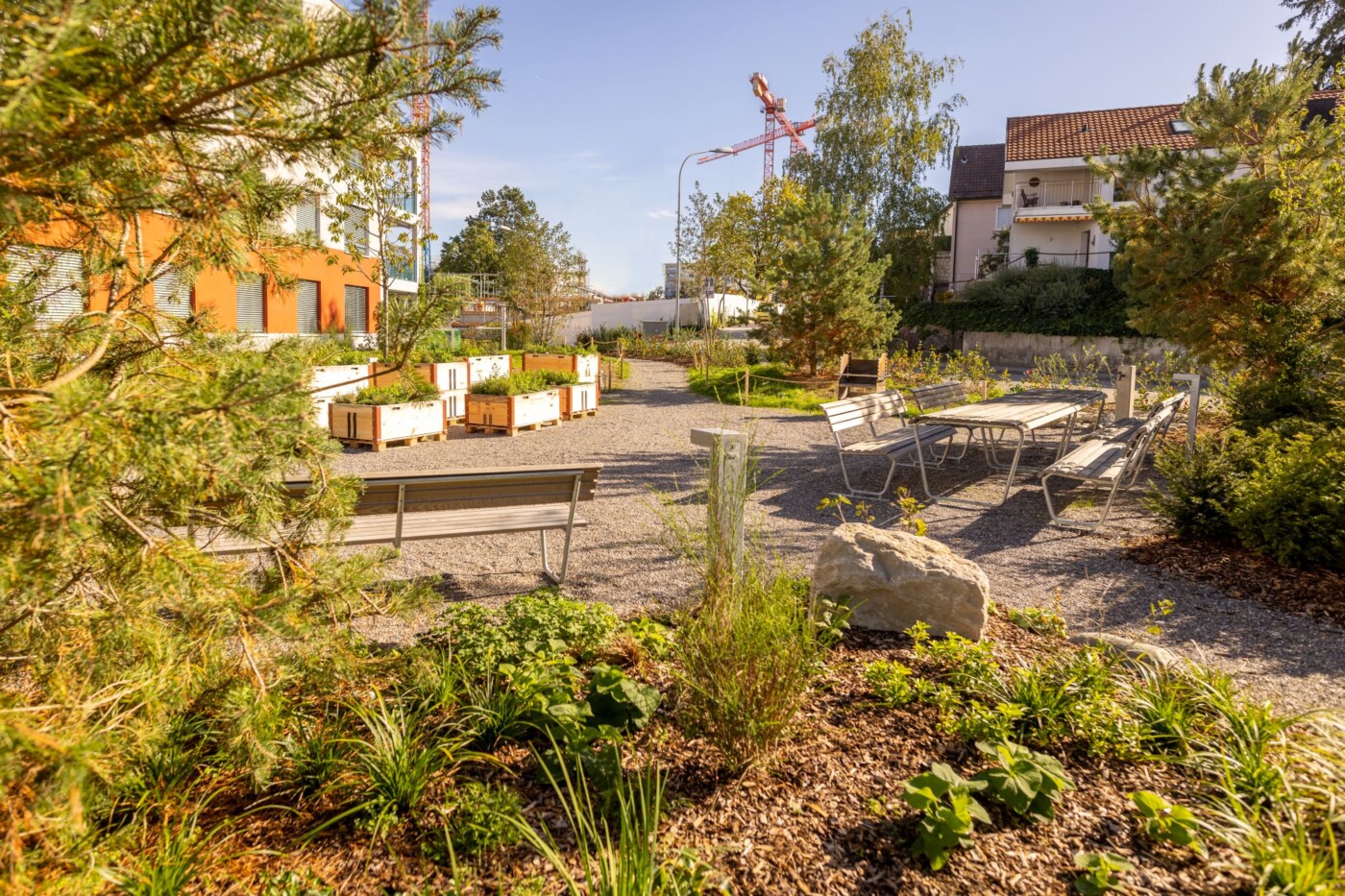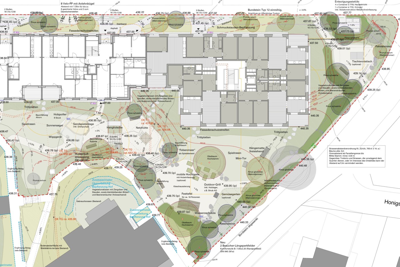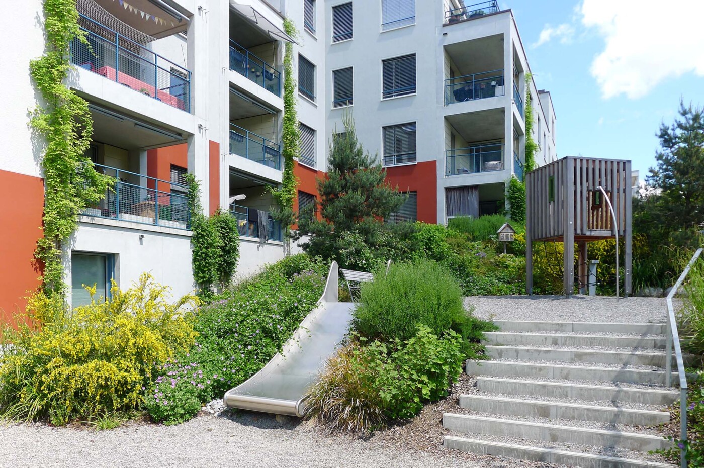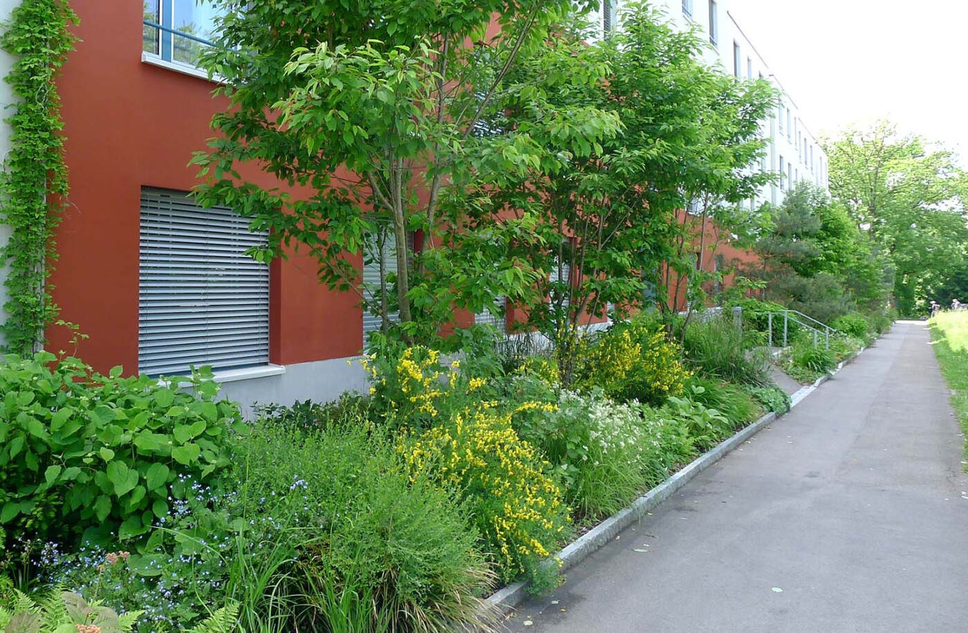 Die Baugenossenschaft Glattal Zürich (BGZ) hat die aus den Jahren 1950 stammenden Gebäude der Kolonie Birch-, Hertenstein durch einen Neubau ersetzt. Die optische Quartieranbindung wurde mittels Schwarzkiefern und Mischheckenkörpern entlang der Strassen umgesetzt. Zum landwirtschaftlich geprägten Landschaftsraum in Richtung Katzenbach wird ein fliessender Übergang mit artenreicher Blumenwiese ausgebildet. Auf drei im Terrain abgestuften Ebenen wurde ein gemeinschaftlich nutzbarer Wohnhof mit bodennahen Vegetationskissen, niederen Struktur- und Blütengehölzen, Beeren- und Fruchtsträuchern sowie drei Hochstammbäumen realisiert. Auf allen Ebenen entstand ein attraktives Angebot für alle Altersgruppen: Von der Sandanlage mit Wasserzapfstelle über eine Balancier- und Kletteranlage mit Rutsche und Klettersteinen, Tischtennisplatte bis zur Tischgruppe mit Grillstelle für ein gemütliches Zusammensein aller Altersklassen.