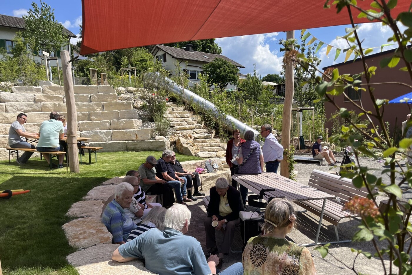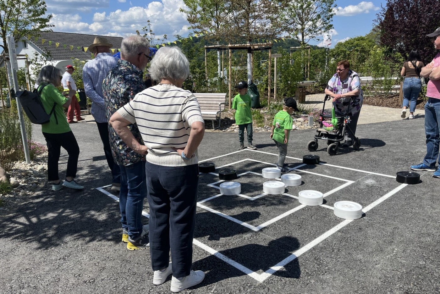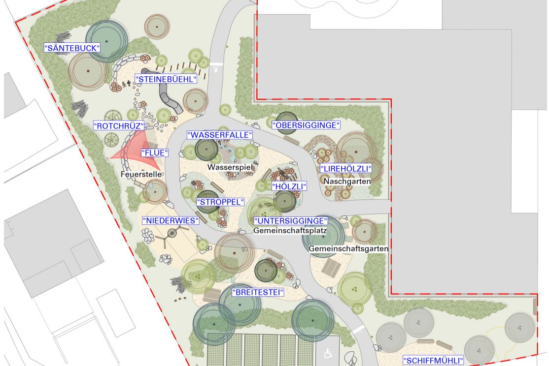 Eine abwechslungsreiche und kreative Gestaltung fördert menschliche Begegnungen und lädt zum Austausch zwischen den Generationen ein. Die einzelnen Bereiche des Generationengartens wurden nach bekannten Flurnamen benannt. Für die geographische Einbettung in die nahe Umgebung wurden grosse Vogelkirschen gepflanzt. Sie spenden natürlichen Schatten und verstärken die ländliche Atmosphäre. Der Erlebnispfad, welcher sich über die gesamte Anlage erstreckt, ermöglicht es den Kindern noch mehr zu erleben und entdecken. Ein Gemeinschaftsplatz mit einem Mühlespiel, ein Gemeinschaftsgarten sowie ein Naschgarten fördern das altersübergreifende Zusammensein. Die rollstuhlgerechte Wegführung und die Sitzmöglichkeiten entlang des Weges ermöglichen es den bewohnenden des Seniorenzentrums, sich unbeschwert zu bewegen.