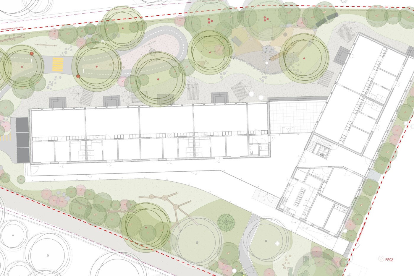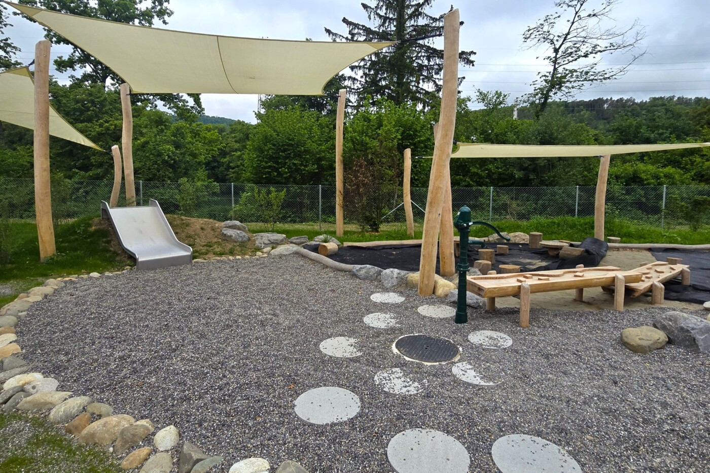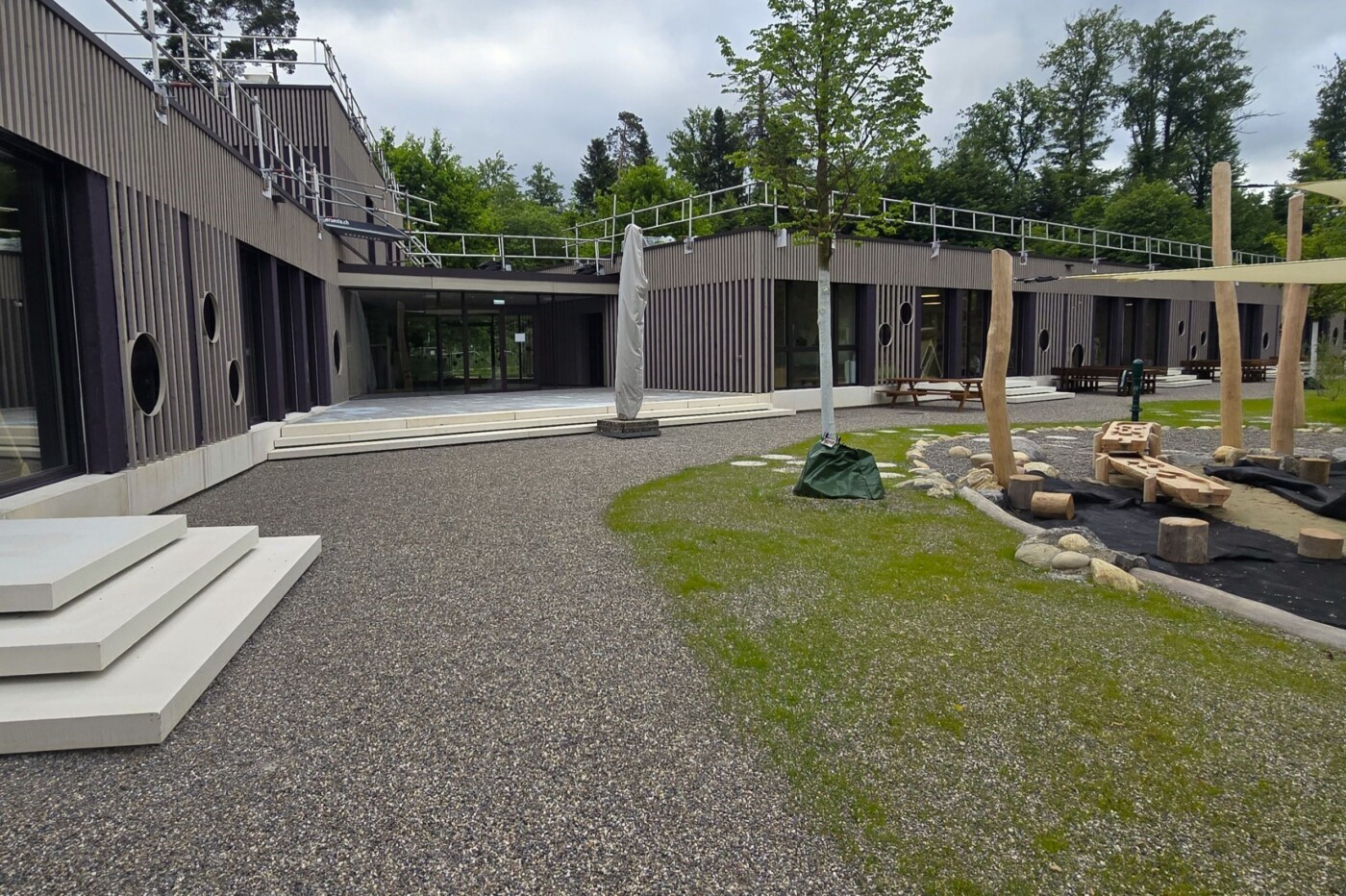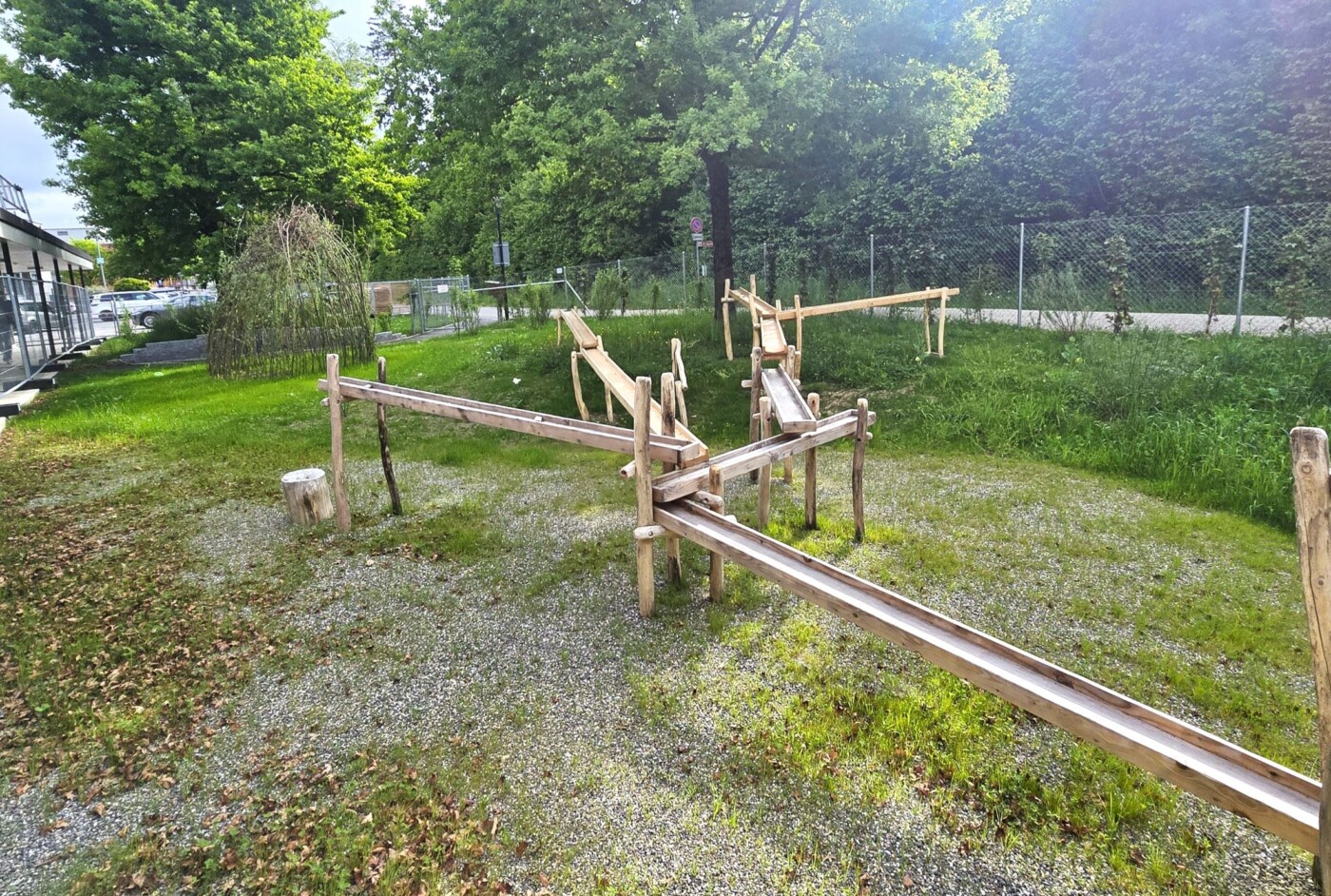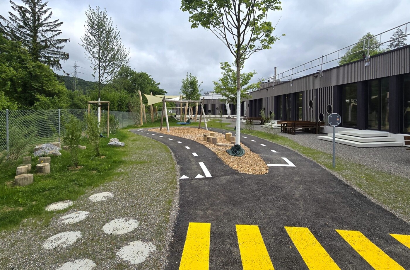 Ein zentrales Element bildet die Bobbycar-Bahn, die sich in einem grosszügigen Rundkurs durch das Gelände schlängelt. Sie bietet nicht nur Spass und Bewegung, sondern auch erste Verkehrserfahrungen und soziale Interaktion. Rund um die Bahn sind vielfältige Spielbereiche angeordnet – von Sand- und Wasserspielen über Balancier- und Kletterelemente bis hin zu ruhigen Rückzugsorten und Sitzecken unter schattenspendenden Waldbäumen. Der Aussenraum nimmt Bezug auf Wald, Aare und Natur. Dabei wird bewusst auf natürliche Materialien wie Holz und Stein gesetzt sowie auf eine ausschliesslich einheimische Bepflanzung.