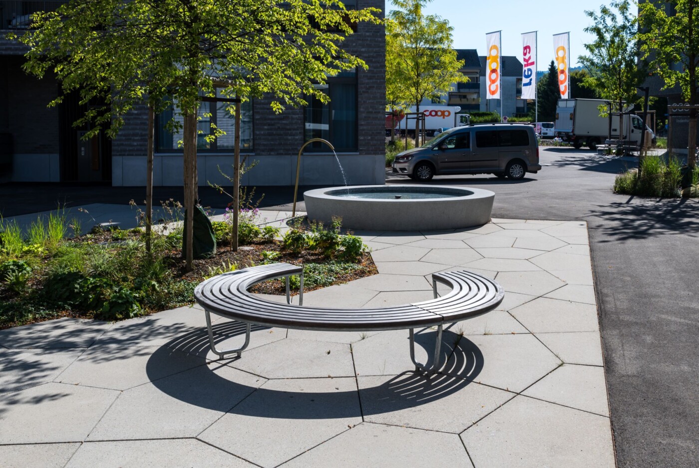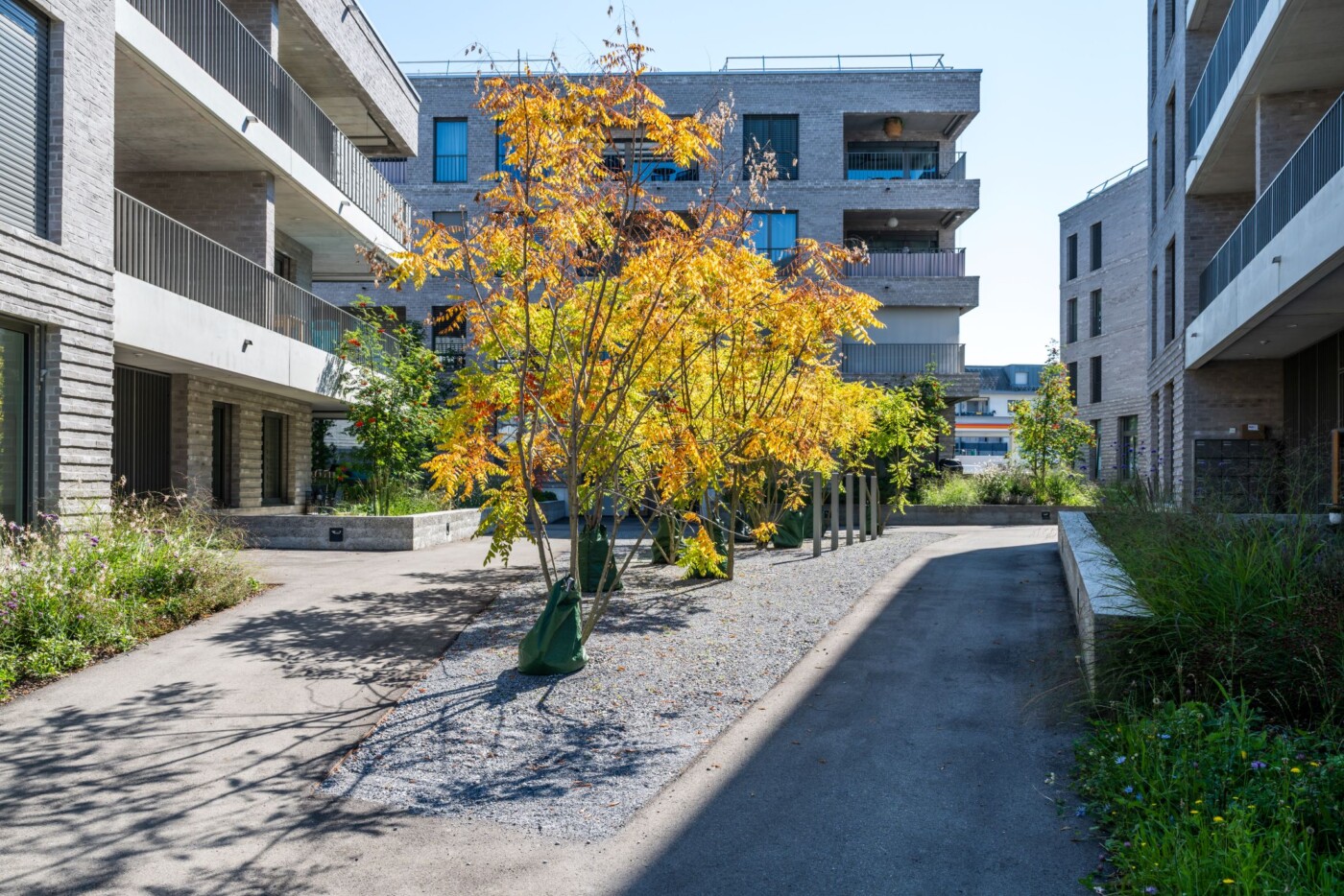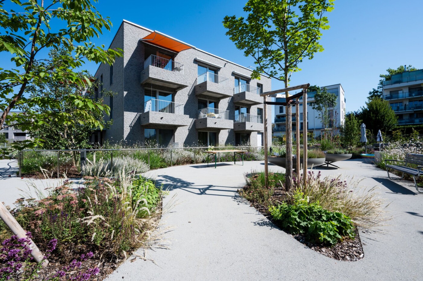 Der fliessende Landschaftsraum bildet die identitätsstiftende Grundstruktur des Quartiers. Grosszügige Grünräume werden der Umgebung der Oase Lindenhof auch zwischen den Gebäudesetzungen zugesprochen. Ein öffentlich durchgängiger Langsamverkehrsweg führt durch das Areal hindurch. Durch das Aufweiten dieses Weges entstehen unterschiedliche Platzabfolgen mit differenzierter Nutzung und sozialräumlichen Qualitäten. Die gezielte Setzung der Bäume als Solitäre oder in Gruppen akzentuieren die Plätze und es entsteht ein harmonisches Ganzes. Durch gezielte vegetative Abstufungen werden die privaten Wohnbereiche mit einem weichen und gestaffelten Übergang von den öffentlichen und halbprivaten Bereichen abgeschirmt.
