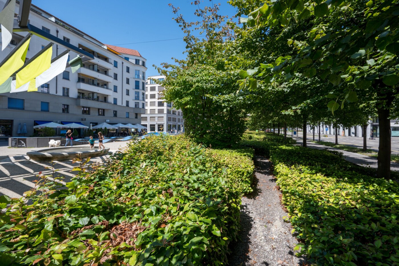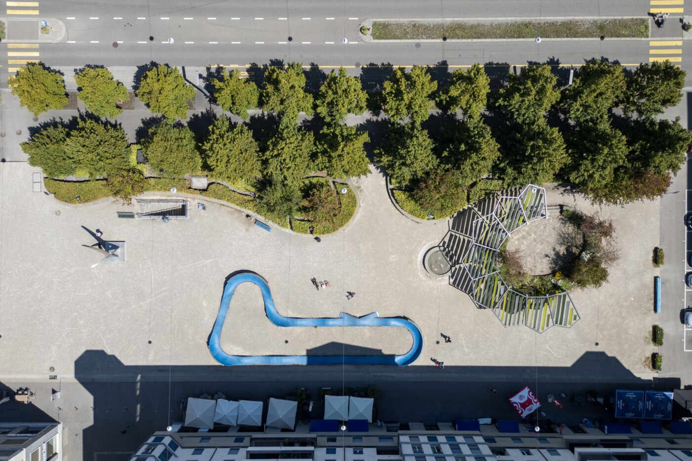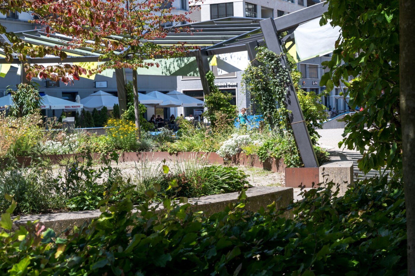 Der private Gestaltungsplan Limmatfeld erlaubt keine festen Überdachungen, weshalb die Beschattung über dem Rondell aus licht- und regendurchlässigen Sonnensegeln sowie einer natürlichen Begrünung entwickelt wird.