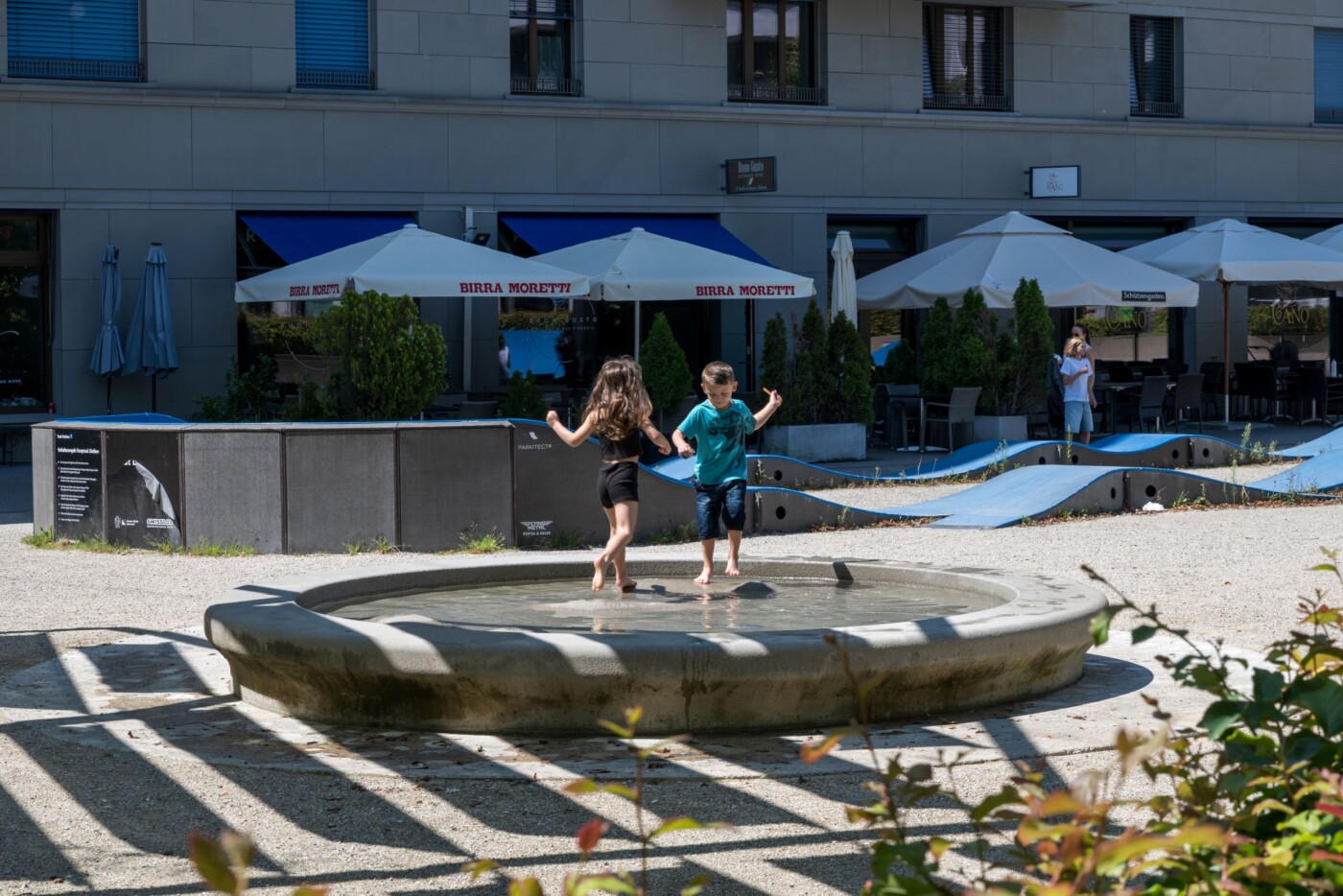 Der Rapidplatz wird zur modernen Oase mitten in der Stadt. Ein Schattendach erweitert die Aufenthaltsmöglichkeiten. Der Brunnen mit Wasserspiel verbessert das Klima auf dem Stadtplatz und bietet den Kindern eine attraktive Spielmöglichkeit.