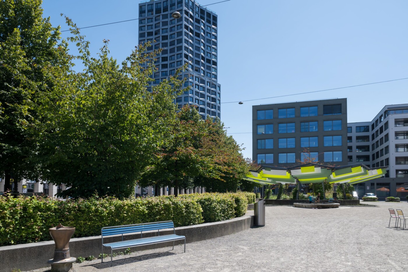 Die imposante Stahlkonstruktion mit farbigen Stofflamellen bringt nebst Beschattung ein optisches Windspiel mit sich und bildet zusammen mit dem Brunnen ein funktionales Gesamtkunstwerk.