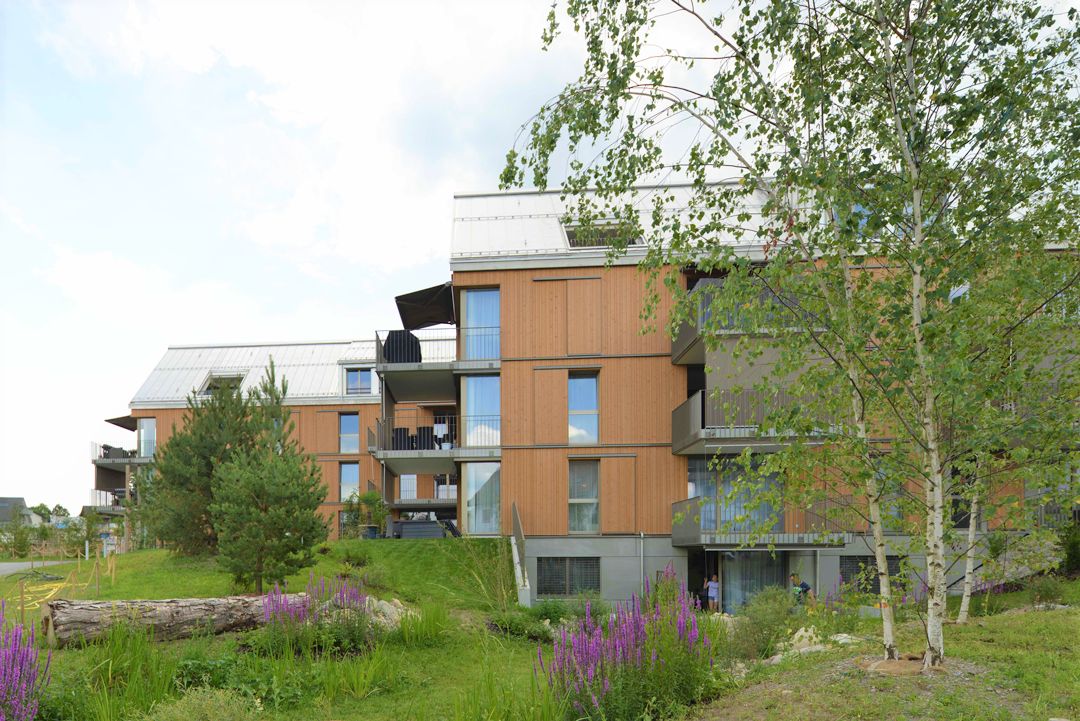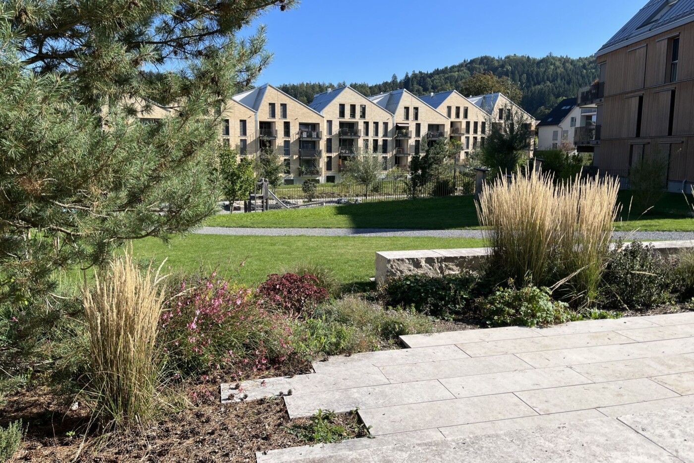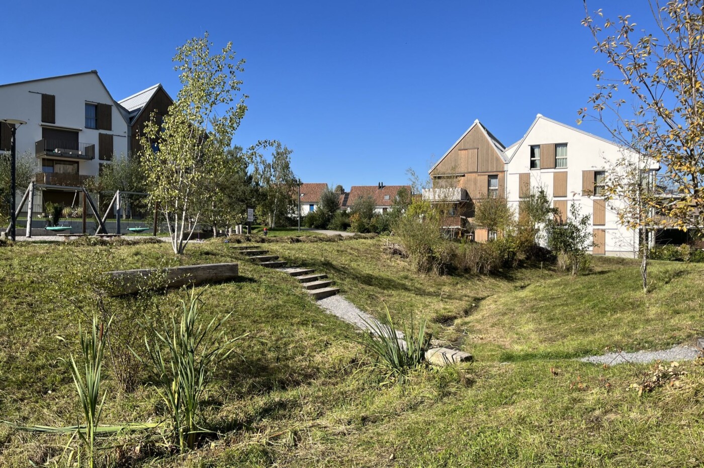 Die umgebenden Hügel um Lufingen und der renaturierte Bach sind die bestimmenden landschaftlichen Elemente der Überbauung. Durchblicke und Aussichten der Häuser mit 191 Wohnungen auf den Bach und die Landschaft sind überall gegeben.
