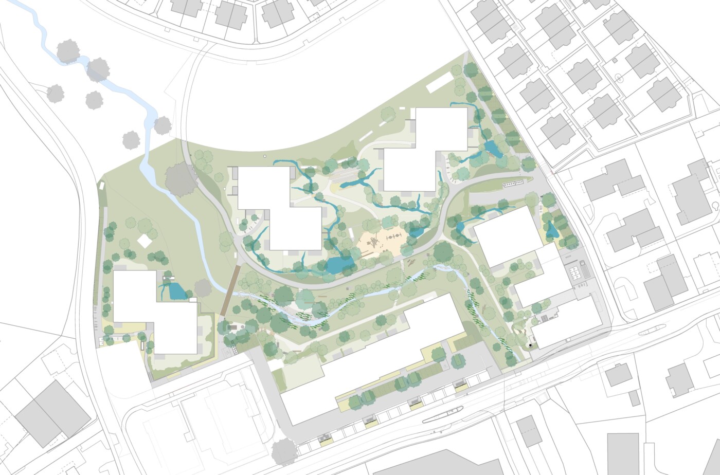 Die kompakte Gebäudestellung ermöglicht einen grosszügigen zusammenhängenden Grünraum. Der Aspbach und seine Ufer werden hierbei zum räumlichen Zentrum. Es entstehen Aussenräume mit vielfältigen Nutzungsmöglichkeiten zum Aufenthalt und Spiel. Gleichzeitig dienen sie der Retention und bieten wertvollen Lebensraum für Flora und Fauna.