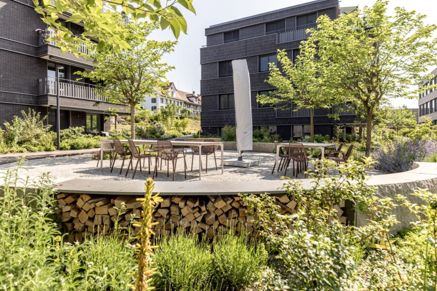 Die Umgebungsgestaltung des Areals des neuen Alters- und Pflegeheims verwebt sich mit dem Quartier und bietet vielfältige Nutzungsqualitäten
